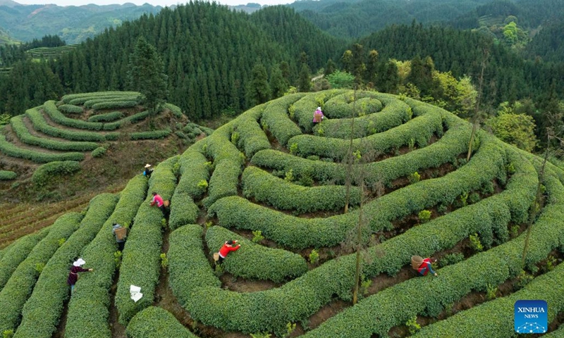 This aerial photo taken on March 30, 2022 shows tea farmers in cooperation with Zhang Yuehua picking fresh tea leaves at a tea garden in Mingshan District of Ya'an City, southwest China's Sichuan Province. Zhang, born in 1959, is a representative inheritor of green tea making technique.(Photo: Xinhua)