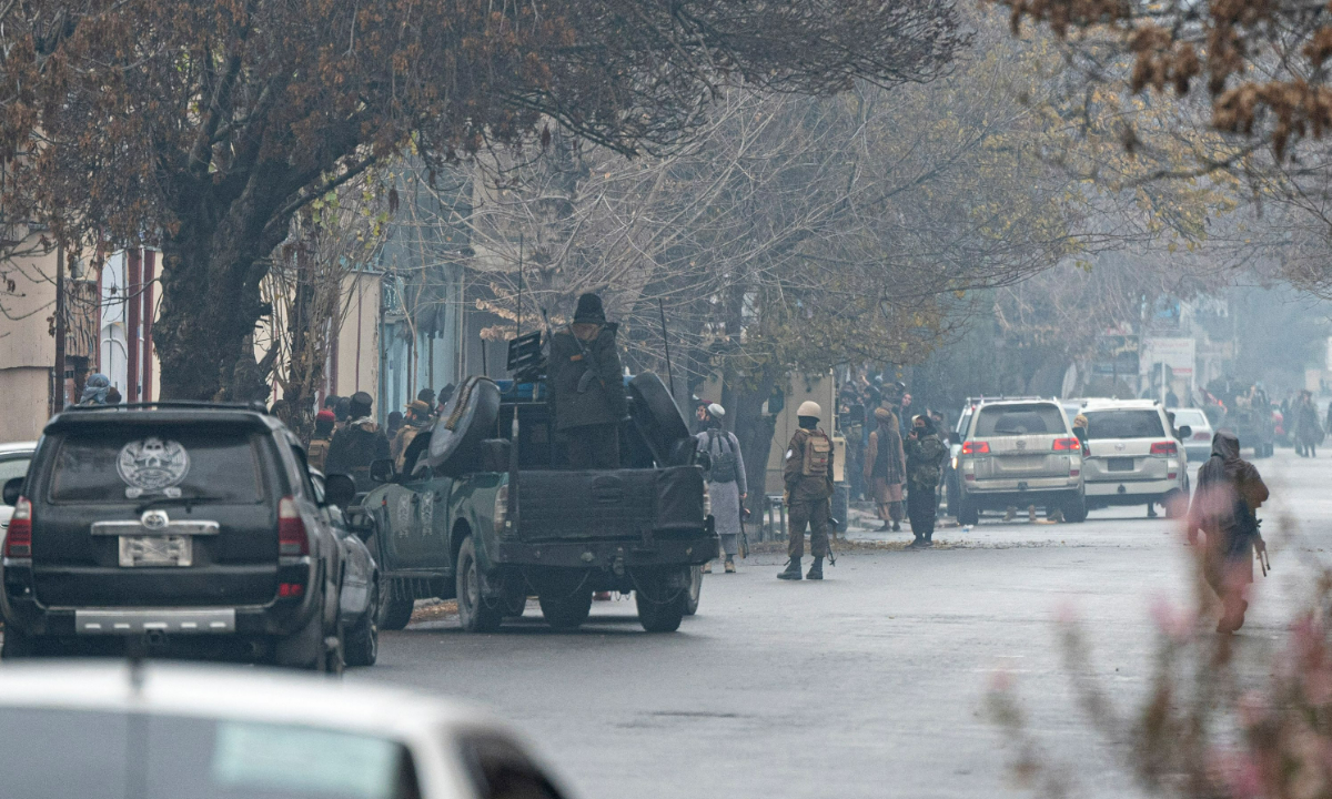 Taliban security forces arrive at the site of an attack at Shahr-e-naw, one of the main commercial areas in Kabul on December 12, 2022. A loud blast and gunfire were heard in the Afghan capital near a guest house popular with Chinese business visitors, a witness said, according to media reports. Photo: VCG