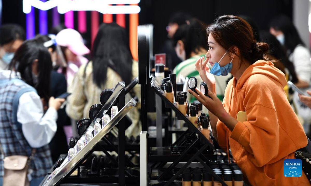 A customer tries cosmetic products in a duty-free shop in Haikou, capital of south China's Hainan Province, Jan 3, 2022. Photo:Xinhua
