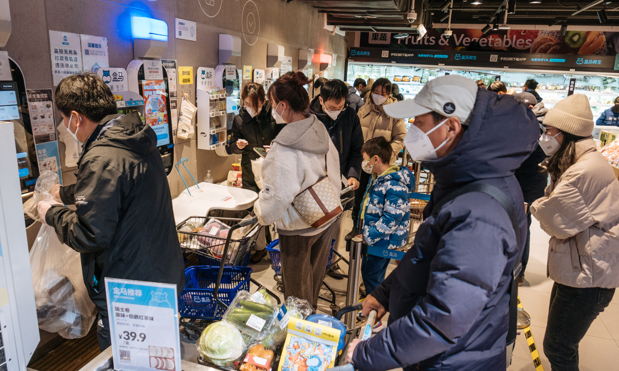 Shoppers queue to use self checkout services at Hema Fresh in Beijing on December 17, 2022. Photo: Li Hao/GT