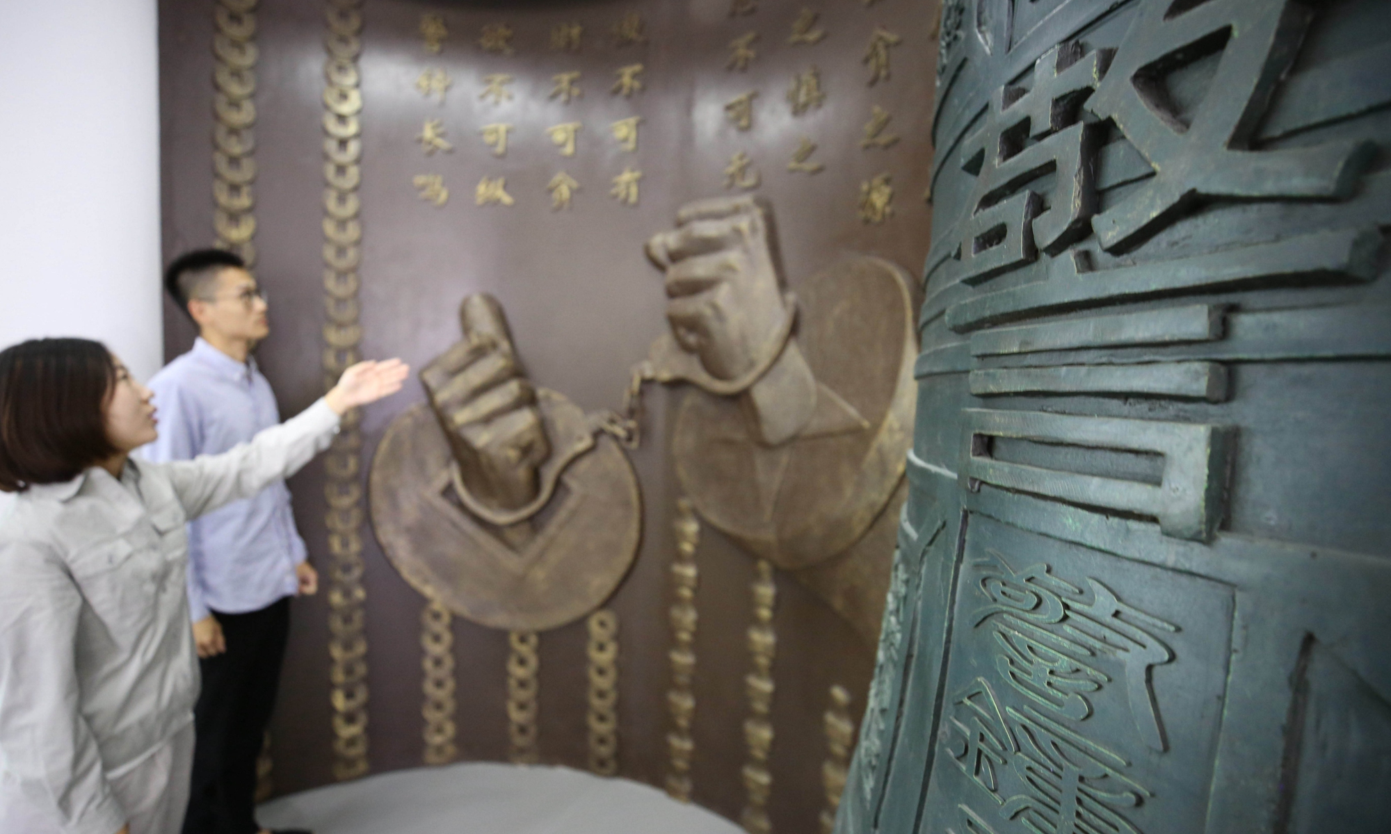 Local civil servants decorate a themed wall at an exhibition featuring combating corruption and building a clean government in Nantong, East China's Jiangsu Province. Photo: IC