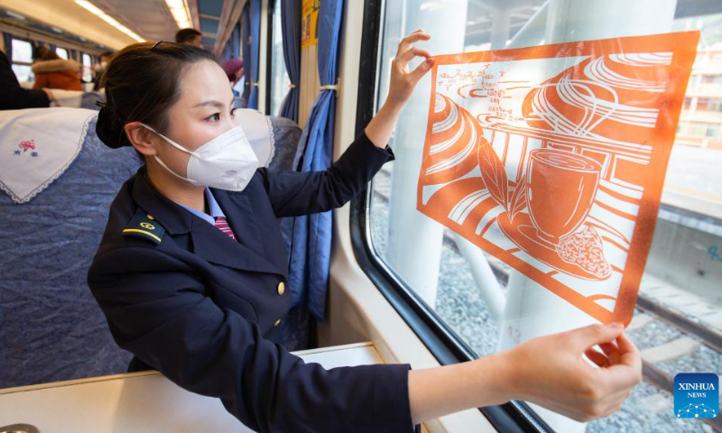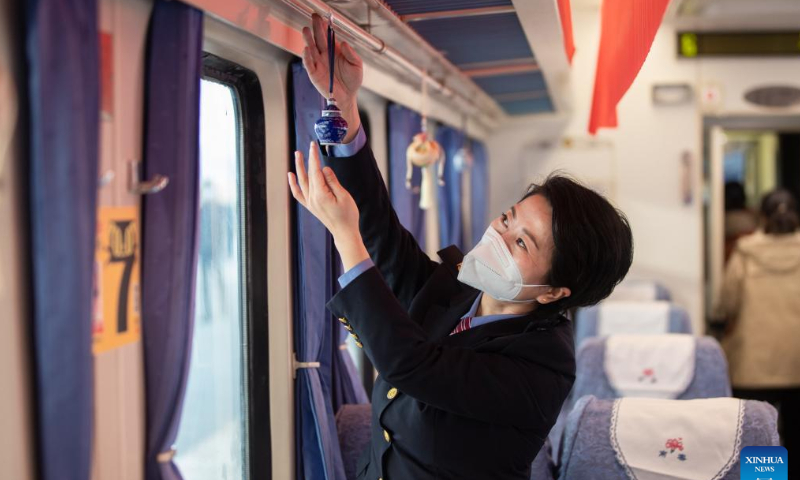 A stewardess decorates the train T8010 at Quanzhou railway station in Quanzhou, southeast China's Fujian Province, Dec. 30, 2022. The 464-km railway linking Xingguo in east China's Jiangxi Province and Quanzhou in southeast China's Fujian Province, started operation on Friday. The designed speed of the line is 160 km/h. Photo: Xinhua