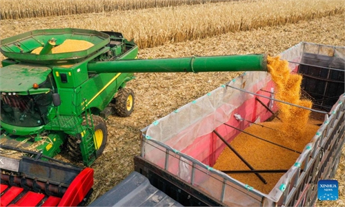 Mechanized corn harvesting in progress in Tongliao on October 13, 2022. Photo: Xinhua