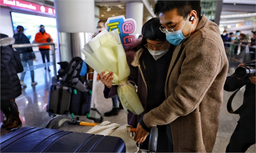 A man waves a banner saying "Welcome back to China" to meet a passenger who just arrived at the Beijing Capital International Airport on January 8, 2023. Photo: Li Hao/GT