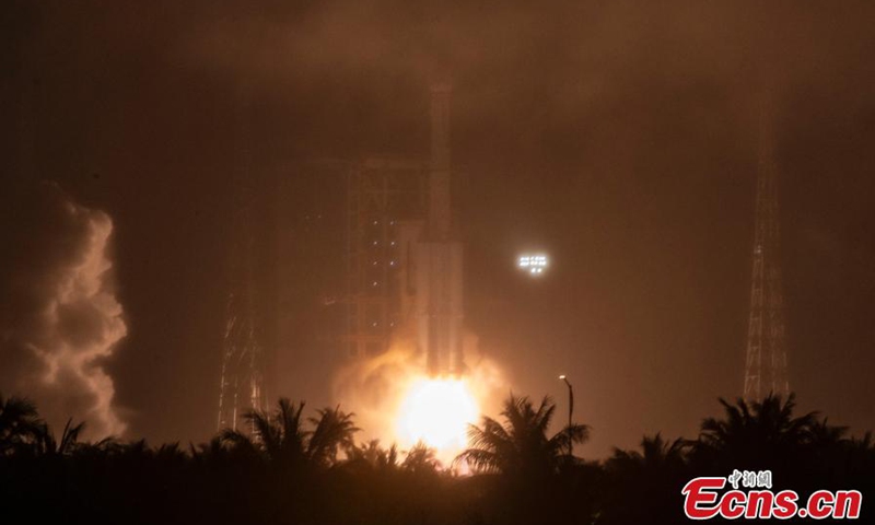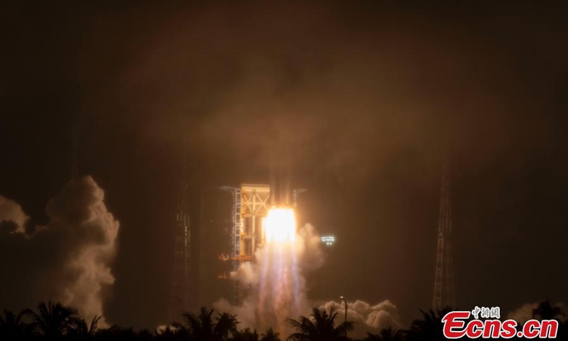 A modified version of the Long March 7 carrier rocket carrying Shijian-23, Shiyan-22A and Shiyan-22B satellites blasts off from the Wenchang Spacecraft Launch Site in south China's Hainan Province, Jan. 9, 2023. The Shijian-23 satellite is mainly used for scientific experiments and technical verification, while the Shiyan-22A and Shiyan-22B satellites serve the in-orbit verification tests of new technologies such as space environment monitoring. (Photo: China News Service/Luo Yunfei)