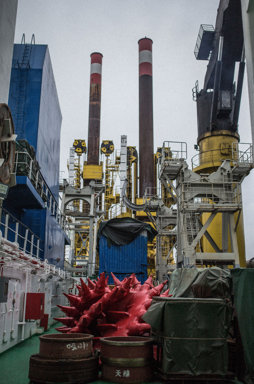 China's top self-propelled cutter-suction dredger, once the most powerful of its kind in Asia, remained operational in its usual orderly fashion, its fierce and gigantic reamer stabbing into the seabed, crushing sediment and rock into pieces, the product of which was transported through pipelines to the shore a few kilometers away. There, a new stretch of land was slowly being formed.
