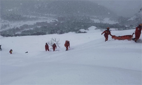 The screenshot of a video on January 18, 2023 shows rescuers at the scene of the avalanche in Nyingchi of Southwest China's Xizang (Tibet) Autonomous Region. Photo: VCG