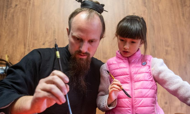 Jake Lee Pinnick writes Spring Festival couplets with his daughter at his home in Danjiangkou, central China's Hubei Province, Jan. 12, 2023. Photo: Xinhua