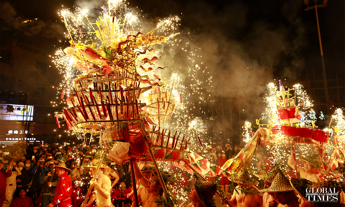 As part of the national intangible cultural heritage with a history of more than 600 years, a fire dragon performance is performed with fireworks on the streets of Jieyang, South China's Guangdong Province on January 31, 2023, showing the charm of Chinese folk customs. Photos: Li Hao/Global Times