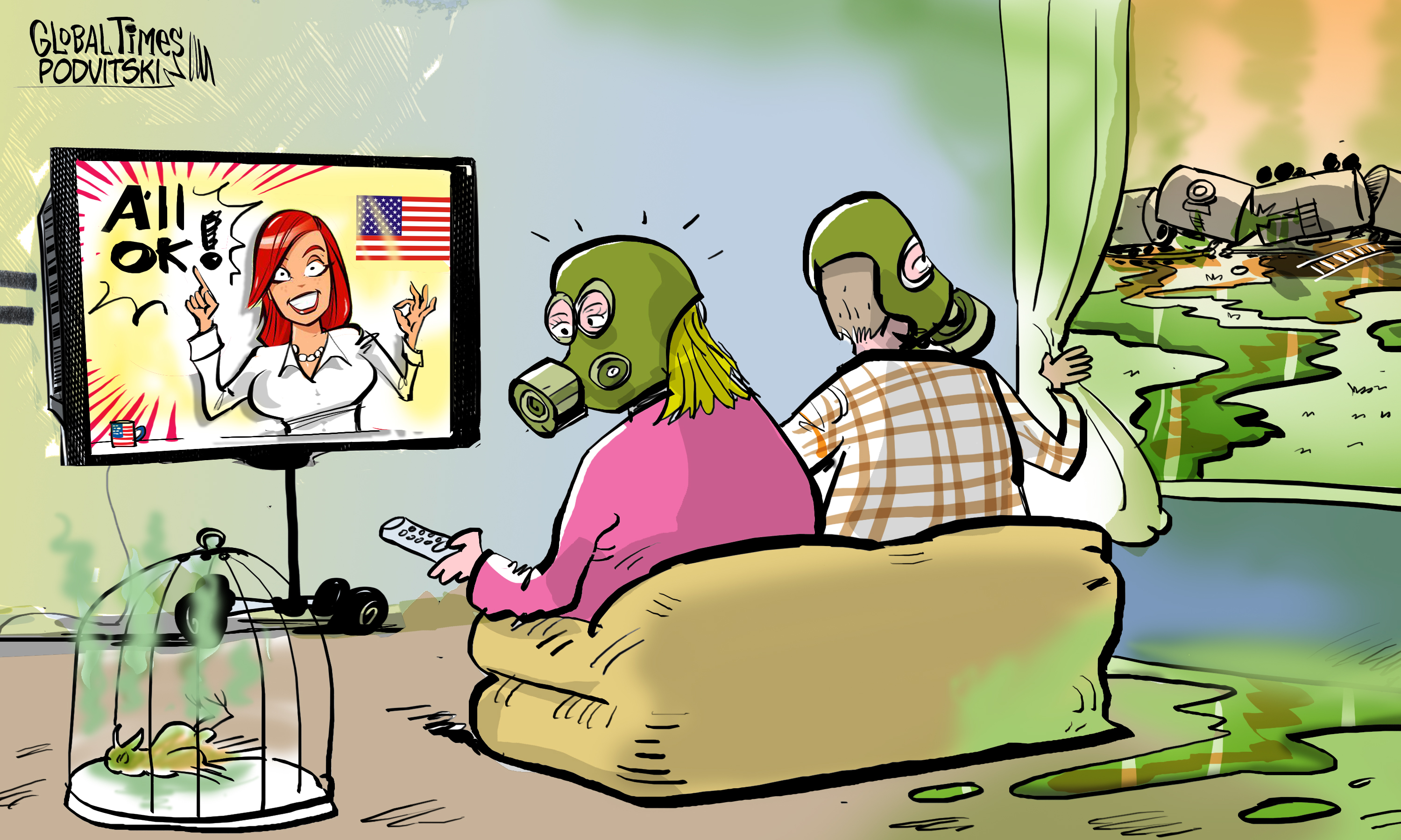 US plays down toxic Ohio train derailment. Cartoon: Vitaly Podvitski
