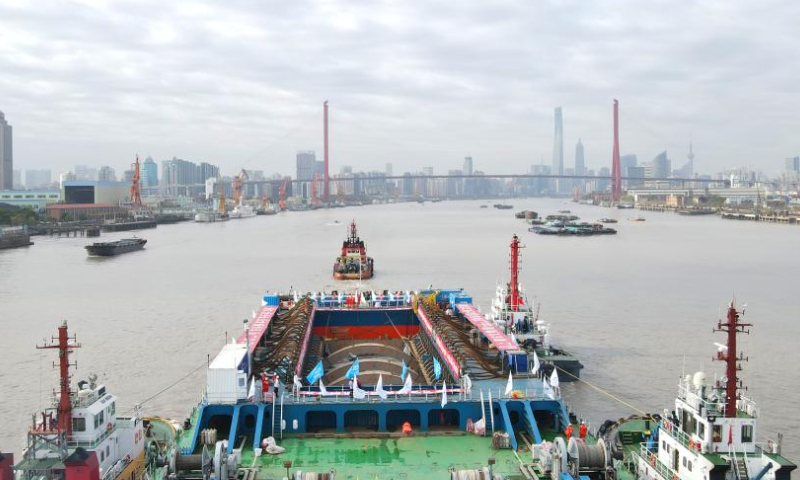The Yangtze No. 2 Ancient Shipwreck is transferred to a dock near the Huangpu River in Shanghai, east China, Nov. 25, 2022. The ancient shipwreck, one of the largest and best-preserved wooden shipwrecks discovered underwater in China to date, was lifted out of waters in Shanghai early Monday. The Yangtze No. 2 Ancient Shipwreck dates back to the reign of Emperor Tongzhi (1862-1875) of the Qing Dynasty. This salvage could offer a useful glimpse of shipbuilding technology during the Qing Dynasty. (Xinhua/Fang Zhe)