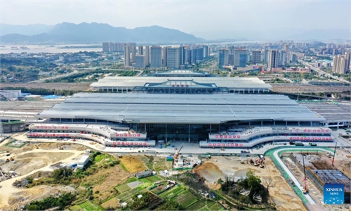 Cranes are seen at the construction site of the Yongjia section of the Hangzhou-Wenzhou high-speed railway in Wenzhou, East China's Zhejiang Province, on March 1, 2023. The 331-kilometer line is an important part of the high-speed railway network in the Yangtze River Delta. The travel time from Hangzhou to Wenzhou will be reduced to less than one hour upon completion. Photo: cnsphoto