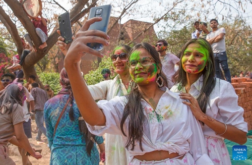 Women smeared with colored powder take selfies during a celebration of the Holi festival in New Delhi, India, March 8, 2023. (Xinhua/Javed Dar)