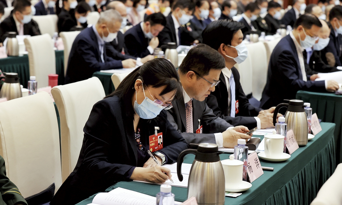 Political advisors take part in a video conference of the first session of the 14th National Committee of the Chinese People's Political Consultative Conference (CPPCC) at a branch venue in Beijing, on March 9, 2023. Photo: Xinhua