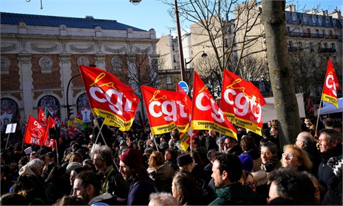 Dockers stand next to a fire and a destroyed car at an entrance to Marseille-Fos Port blocked during a rally called by French union General Confederation of Labour against the French government's proposed pensions reform, in Marseille on March 14, 2023. Photo: AFP