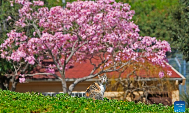 A cat basks in front of blooming flowers in downtown Beirut, Lebanon, on March 16, 2023.(Photo: Xinhua)