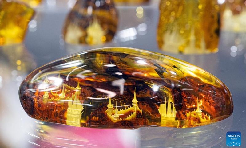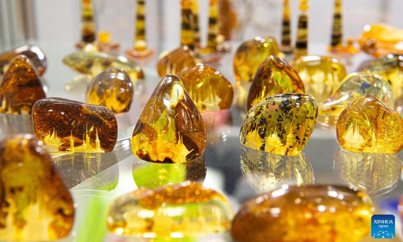 This photo taken on March 17, 2023 shows amber products on the International Baltic Jewelry Show in Vilnius, Lithuania. The 19th International Baltic Jewelry Show titled Amber Trip was held from March 15 to 18 in Vilnius.(Photo:Xinhua)