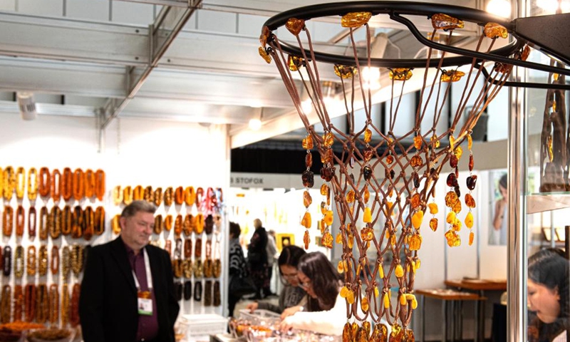 Visitors look at amber products on the International Baltic Jewelry Show in Vilnius, Lithuania, March 17, 2023. The 19th International Baltic Jewelry Show titled Amber Trip was held from March 15 to 18 in Vilnius. (Photo:Xinhua)