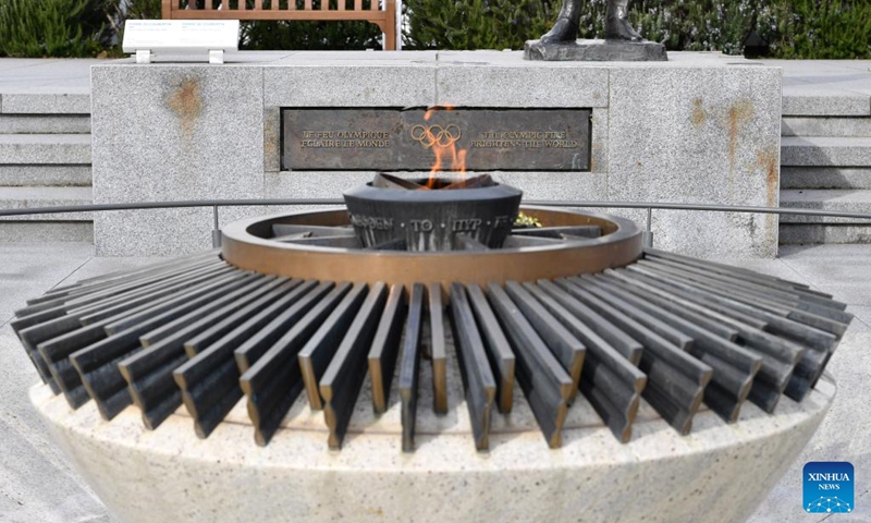 A burning fire symbolizing the Olympic flame is seen at the International Olympic Museum in Lausanne, Switzerland, March 21, 2023. (Xinhua/Lian Yi)