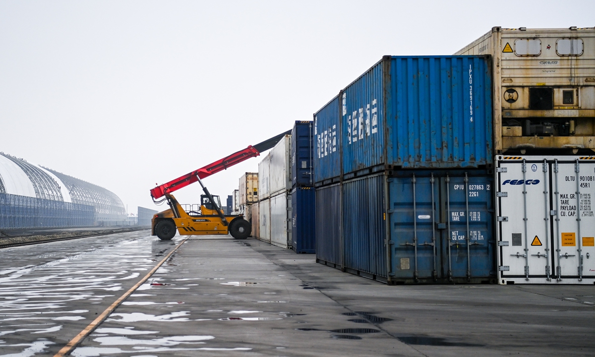 A truck carries containers at a railway port in Hunchun, northeast China's Jilin Province on March 22, 2023. Hunchun, as a major trade channel, has the railway port and the highway port to Russia. Photo: Xinhua
