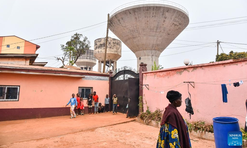 This photo taken on March 2, 2023 shows a grandmother and children in a yard next to the water tower in Bafoussam, Cameroon.(Photo: Xinhua)