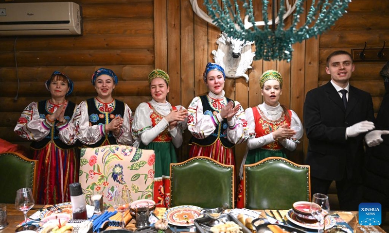 Russian waiters stage a performance at a Russian restaurant in Manzhouli, north China's Inner Mongolia Autonomous Region, March 15, 2023. Popularity of Russian goods and foods has revived among local customers after the land port of Manzhouli resumes services. (Xinhua/Bei He)