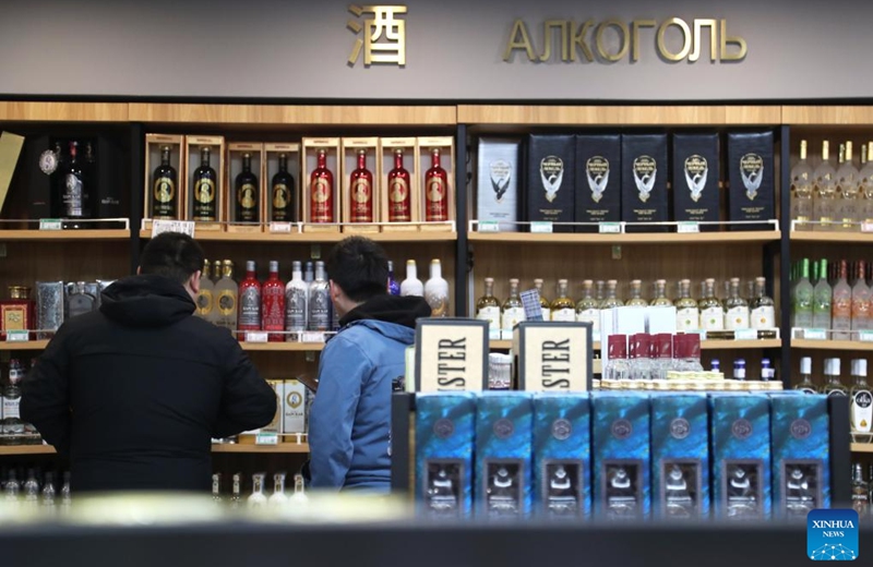 People shop for liquor at a Russian goods store in Manzhouli, north China's Inner Mongolia Autonomous Region, March 16, 2023. Popularity of Russian goods and foods has revived among local customers after the land port of Manzhouli resumes services. (Xinhua/Wang Kaiyan)