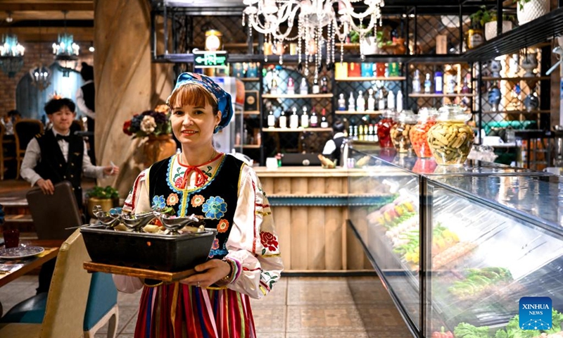 A Russian waitress serves food at a Russian restaurant in Manzhouli, north China's Inner Mongolia Autonomous Region, March 15, 2023. Popularity of Russian goods and foods has revived among local customers after the land port of Manzhouli resumes services. (Xinhua/Bei He)