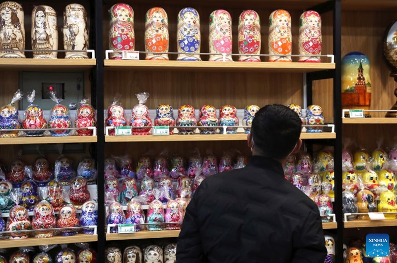 A customer shops for matryoshka dolls at a Russian goods store in Manzhouli, north China's Inner Mongolia Autonomous Region, March 16, 2023. Popularity of Russian goods and foods has revived among local customers after the land port of Manzhouli resumes services. (Xinhua/Wang Kaiyan)