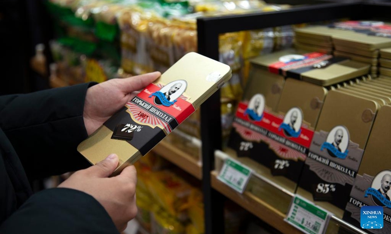A customer shops for chocolates at a Russian goods store in Manzhouli, north China's Inner Mongolia Autonomous Region, March 16, 2023. Popularity of Russian goods and foods has revived among local customers after the land port of Manzhouli resumes services. (Xinhua/Wang Kaiyan)