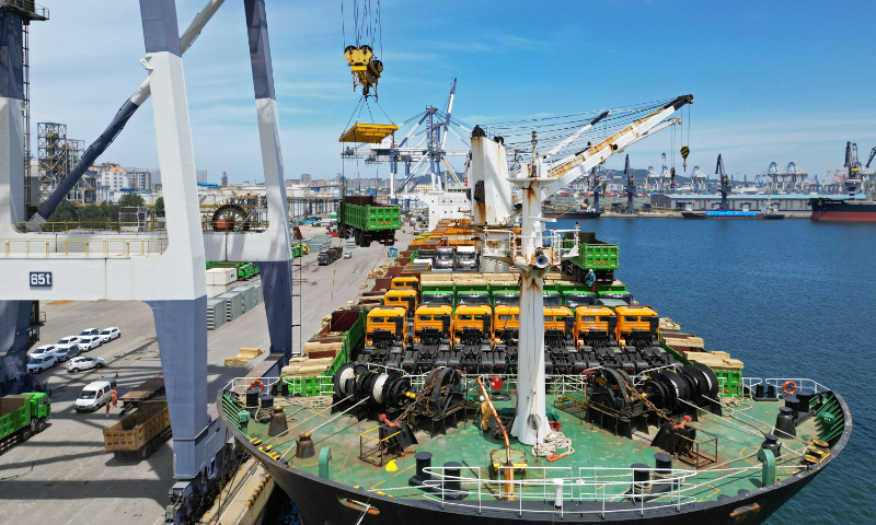 Engineering vehicles for export to Africa are loaded on a liner at Yantai Port, East China's Shandong Province, on July 19, 2022. Photo: VCG