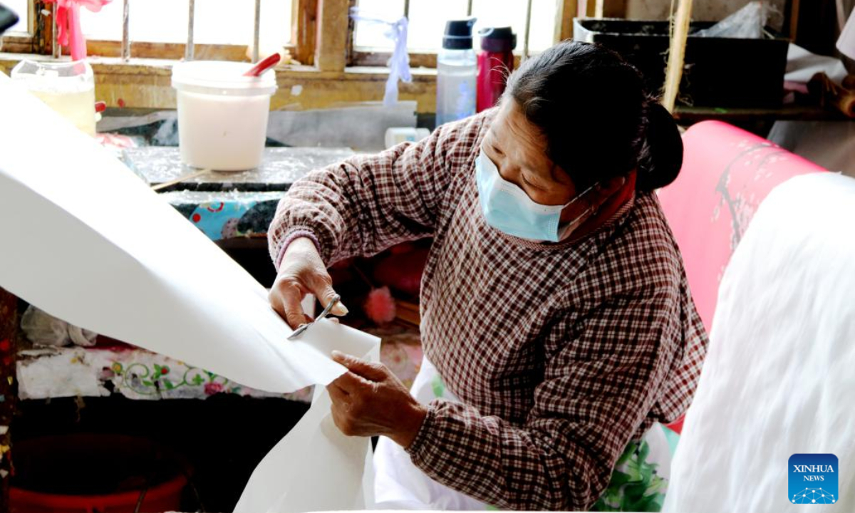 Villager Zhang Shunnyu trims the edges of an oil-paper umbrella at a factory making Jialu oil-paper umbrella, a traditional Chinese handicraft with a history of over 800 years, in Wuyuan County, east China's Jiangxi Province, March 1, 2023. Photo:Xinhua