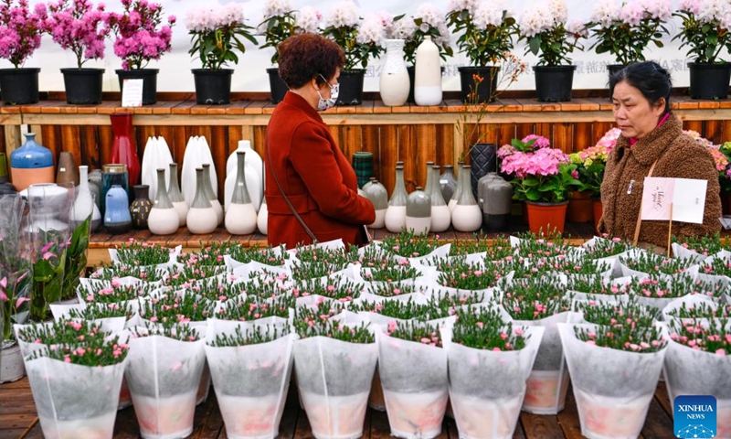 Tourists buy flowers at a flower demonstration point in Bailidujuan administrative area in Bijie, southwest China's Guizhou Province, March 28, 2023. In recent years, the Bailidujuan administrative area in Bijie has set up intelligent greenhouses for cultivating alpine flower species such as azalea, with the goal of developing rural tourism and boosting incomes of local farmers(Photo: Xinhua)