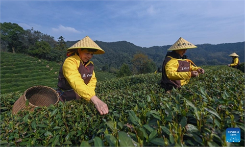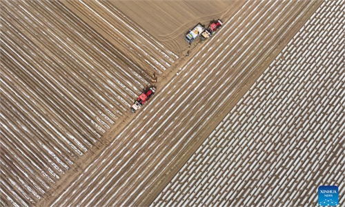 Farmers in Northwest China's Xinjiang region manage bee farms as the woods enter the blossoming period on March 30, 2023. In 2021, China's honey production reached 450,000 tons with related products valued at 30 billion yuan ($4.36 billion), according to Farmers' Daily. Photo: VCG