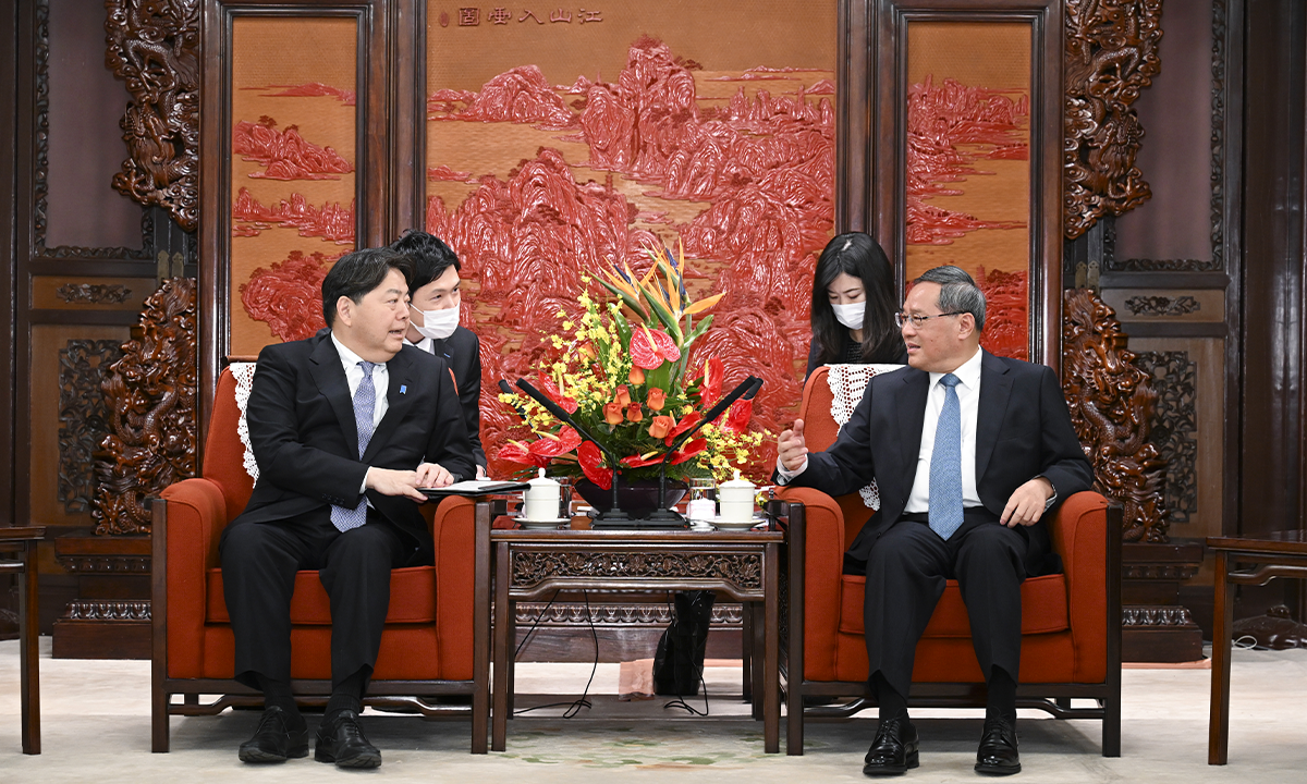Chinese Premier Li Qiang (right) meets Yoshimasa Hayashi, Japan’s Minister for Foreign Affairs, in Beijing on April 2, 2023. Photo: Xinhua