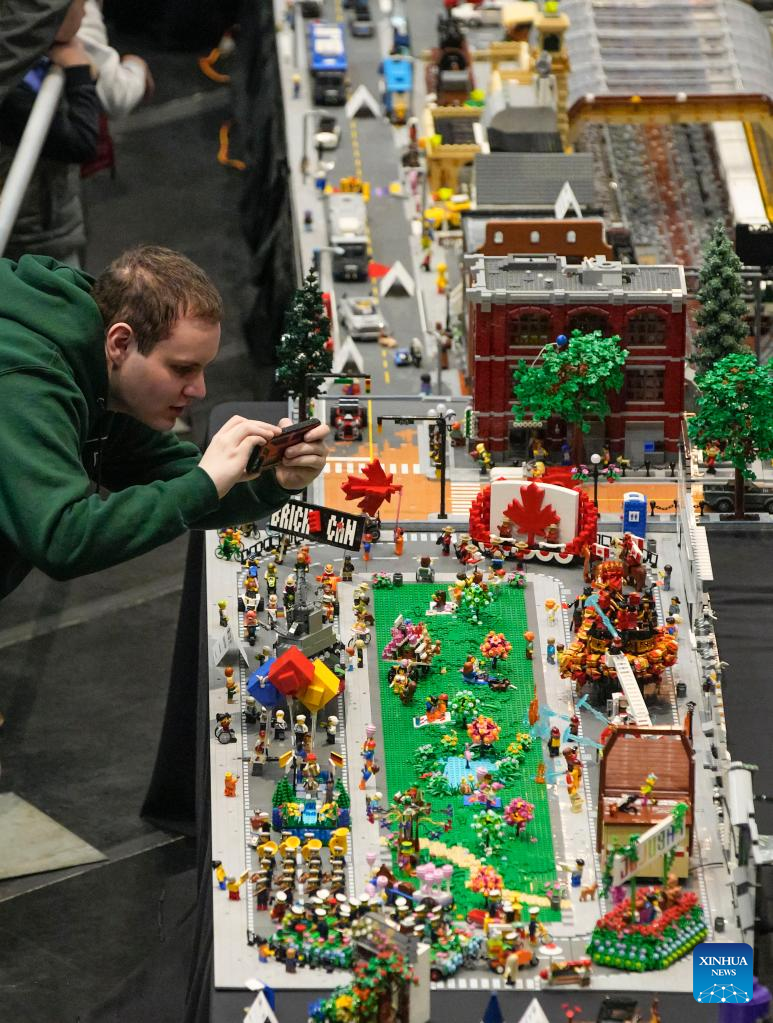A visitor takes photos of a LEGO work at the BrickCan LEGO exhibition at the River Rock Theatre in Richmond, British Columbia, Canada, on April 22, 2023. Over 300 LEGO builders from around the world showcased their creations at BrickCan 2023, which was held here in Richmond between April 22 and 23. (Photo by Liang Sen/Xinhua)