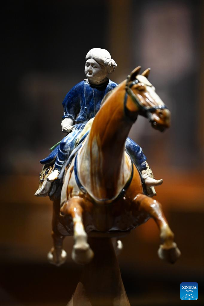 This photo taken on May 8, 2023 shows a Tang Dynasty (618-907) tri-colored galloping horse at Xi'an Museum in Xi'an, northwest China's Shaanxi Province. (Xinhua/Li Yibo)