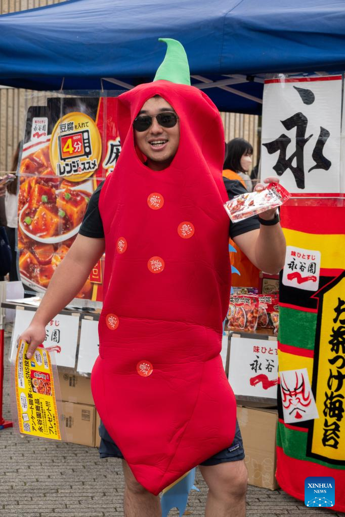 A staff member in chili pepper costume is pictured during a Sichuan food festival held at Nakano Central Park, Tokyo, Japan, on May 14, 2023. The Sichuan food festival was held here from May 13 to May 14. (Xinhua/Zhang Xiaoyu)