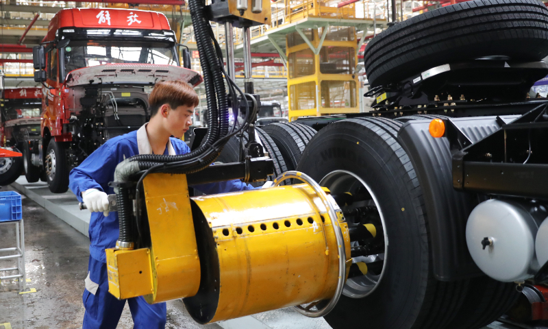 A worker assembles a truck at an auto company in Qingdao, East China's Shandong Province, on May 15, 2023. Qingdao's Jimo district has more than 400 vehicle and supporting production enterprises, covering the complete industry chain, which have injected new momentum into the development of local economy. Photo: VCG
