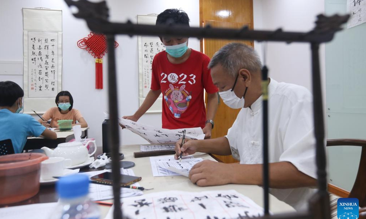An instructor checks the students' calligraphy works at the China Cultural Center in Yangon, Myanmar, May 23, 2023. Some students in Myanmar have spent much of the summer vacation learning Chinese calligraphy at the China Cultural Center in Yangon.(Photo by Myo Kyaw Soe/Xinhua)