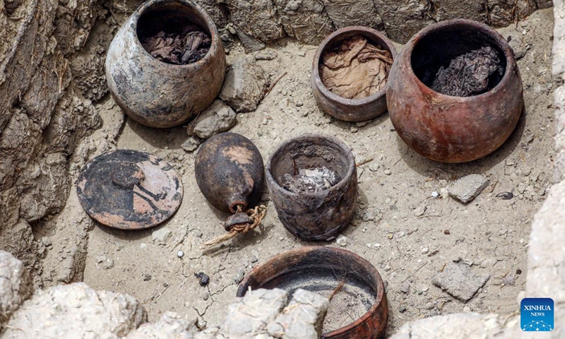 This photo taken on May 27, 2023 shows clay pots used in mummification unearthed at the archaeological site in Saqqara necropolis, south of the capital Cairo, Egypt. Egypt announced on Saturday the discovery of two ancient embalming workshops for humans and animals along with two tombs and a collection of artifacts in Saqqara necropolis, south of the capital Cairo. (Xinhua/Ahmed Gomaa)