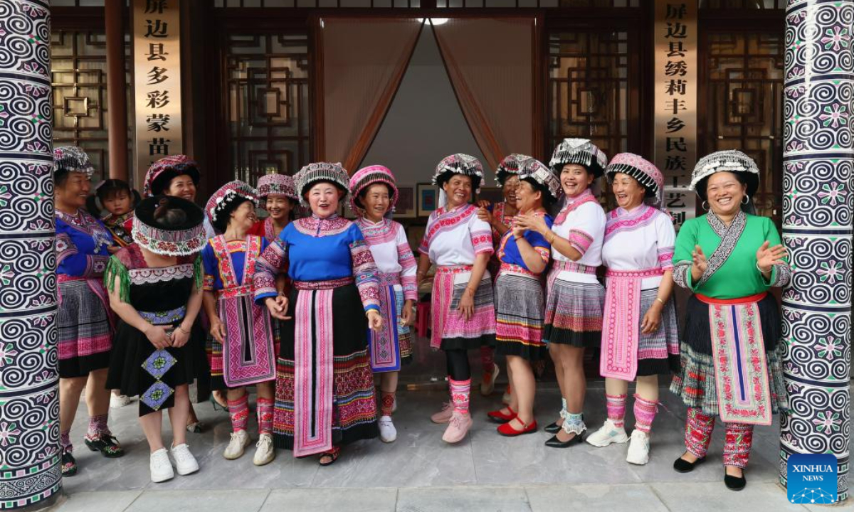 Women of Miao ethnic group pose for a group photo at an embroidery workshop in Pingbian Miao Autonomous County, southwest China's Yunnan Province, June 1, 2023. Pingbian Miao Autonomous County has been making efforts to support and develop its embroidery industry, trying to provide job opportunities to local women. Photo:Xinhua