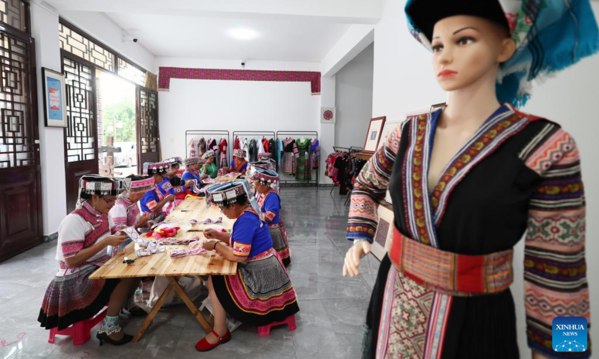 Women of Miao ethnic group make embroidery works at a workshop in Pingbian Miao Autonomous County, southwest China's Yunnan Province, June 1, 2023. Pingbian Miao Autonomous County has been making efforts to support and develop its embroidery industry, trying to provide job opportunities to local women. Photo:Xinhua