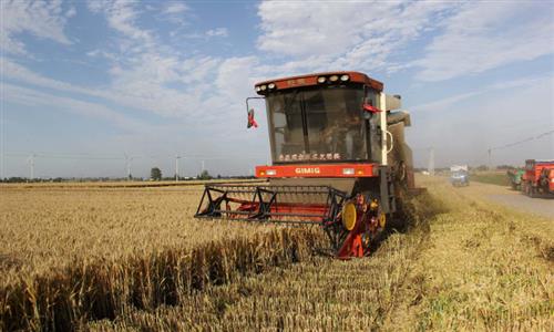 Farmers drive machines to harvest wheat in Hai'an city, East China's Jiangsu Province on June 7, 2023. As a total of 550,000 mu (36,666.7 hectares) of wheat in the city enters the harvest season, local farmers work day and night to ensure that the crops can be collected quickly. Photo: IC