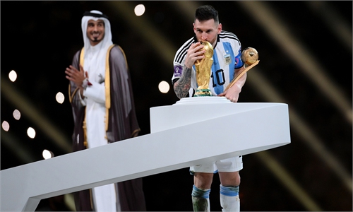 Lionel Messi of Argentina kisses the World Cup Trophy while holding the Golden Boot award on December 18, 2022 in Lusail City, Qatar. Photo: VCG
