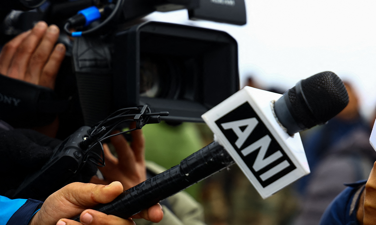 A reporter holds a microphone with the logo of ANI during a press conference in India, on March 3, 2023. Photo: VCG