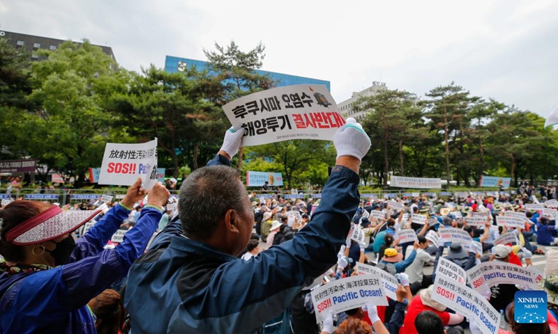 People rally to protest against Japan's planned discharge of radioactive wastewater in Seoul, South Korea, June 12, 2023. Thousands of South Korean fishermen gathered on Monday near the parliamentary building in Seoul to clamor against Japan's planned discharge of radioactive wastewater from its crippled Fukushima Daiichi nuclear power plant into the Pacific Ocean(Photo: Xinhua)