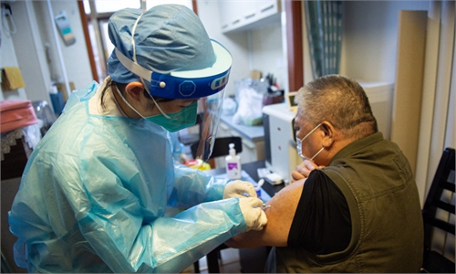 Three men hold Chinese national flags at Tiananmen Square in Beijing on Tuesday after the flag-raising ceremony. Photo: Cui Meng/GT