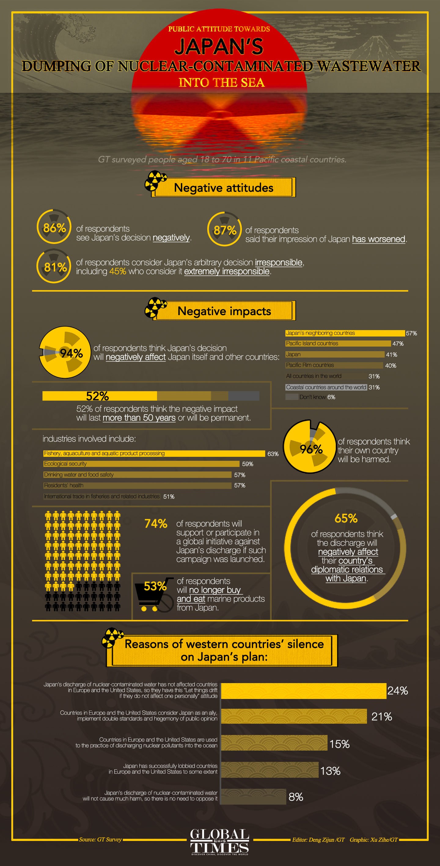 More than 80 percent of respondents in 11 countries in the Asia-Pacific region except for Japan said Japan's plan of dumping nuclear-contaminated water into the sea is "irresponsible" and nearly 90 percent of respondents showed negative sentiments such as worries and shock toward the plan, and 94 percent of them deemed such move will have a negative effect not only on Japan and Pacific Rim countries but also the whole world, a survey conducted by the Global Times Research Center found.
