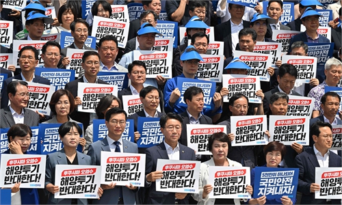 People rally in front of the Second Members' Office Building of the House of Representatives to protest against the Japanese government's plan to discharge nuclear-contaminated water into the sea in Tokyo, Japan, May 16, 2023. Hundreds of Japanese people on Tuesday gathered at multiple locations in Tokyo to protest against the government's plan to discharge nuclear-contaminated water from the crippled Fukushima Daiichi Nuclear Power Plant into the sea, demanding immediate suspension of such plan.(Photo: Xinhua)